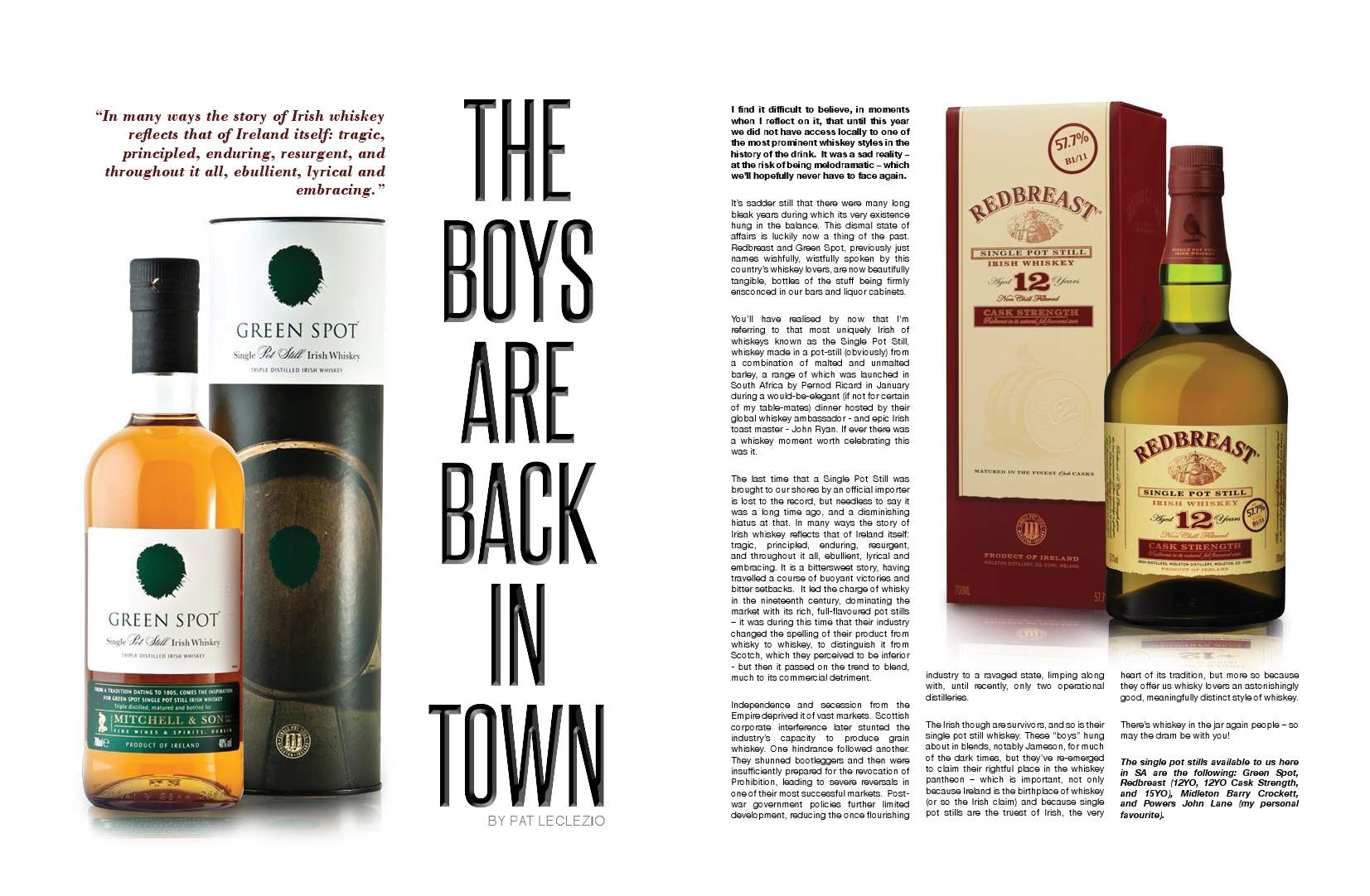 You’ll have realised by now that I’m referring to that most uniquely Irish of whiskeys known as the Single Pot Still, whiskey made in a pot-still (obviously) from a combination of malted and unmalted barley, a range of which was launched in South Africa by Pernod Ricard in January during a would-be-elegant (if not for certain of my table-mates) dinner hosted by their global whiskey ambassador – and epic Irish toast master – John Ryan. If ever there was a whisky moment worth celebrating this was it.